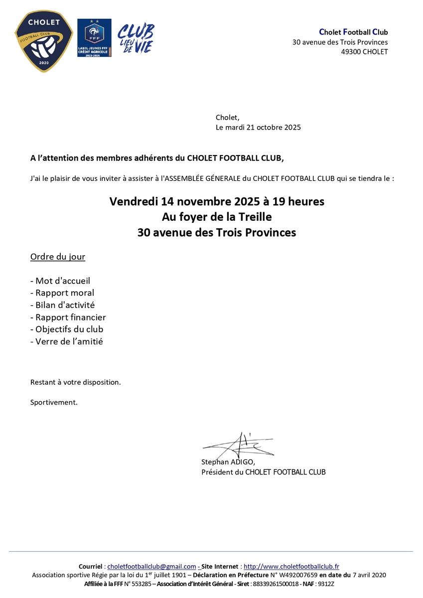 Comme chaque saison, le Cholet Football Club vous invite à son Assemblée Générale.